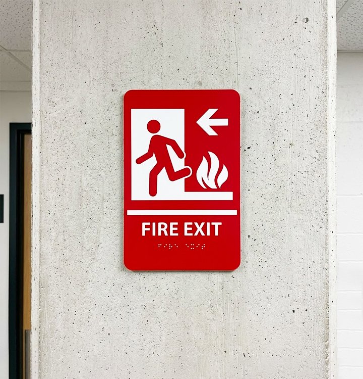 This fire exit signage is designed to ensure clear and accessible identification of emergency exit routes. Sized at 6 x 9 inches, it features raised tactile text and braille elements that comply with ADA standards, allowing visually impaired individuals to quickly locate exit points.