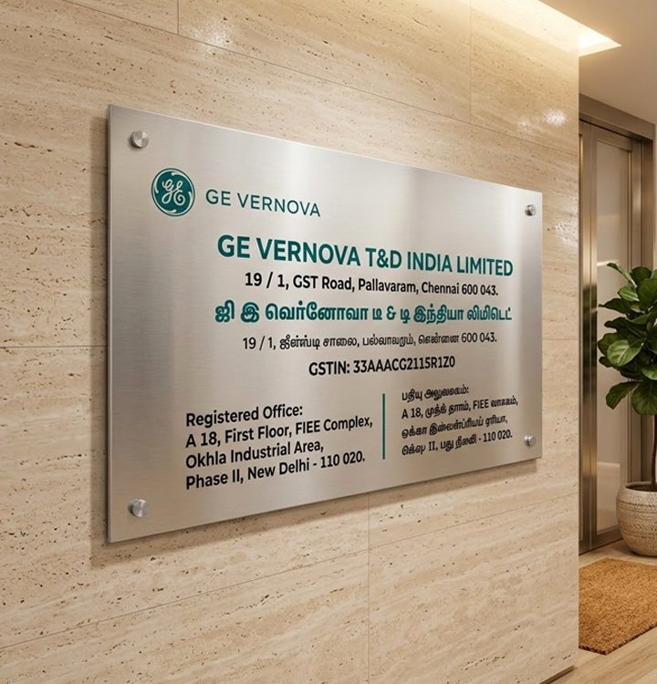 This stainless steel (SS) etched name plate offers a premium and long-lasting solution for professional identification and compliance displays. Sized at 48 x 24 inches, it features precision etching and engraving for sharp, permanent text and graphics, making it ideal for GST boards, company name plates, and official signage.